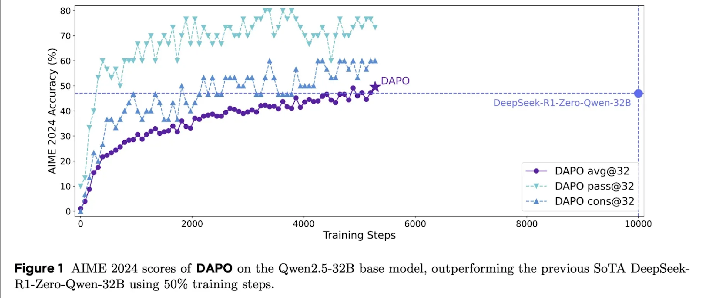 - DAPO Team: They also started with Qwen2.5–32B as the base model, and: First tried using standard GRPO (not DeepSeek’s approach) and only got 30 points. Then developed DAPO by enhancing GRPO, achieving 50 points.