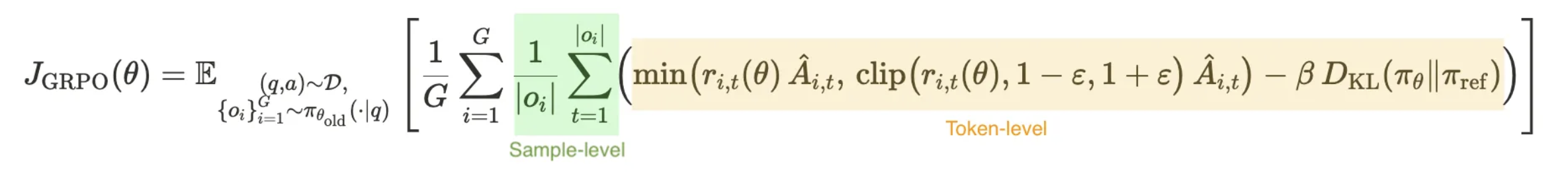 Standard approaches like GRPO calculate a loss for each token but then average these losses at the sample level before aggregating across all samples. This effectively gives equal weight to each response regardless of its length, which creates two problems: