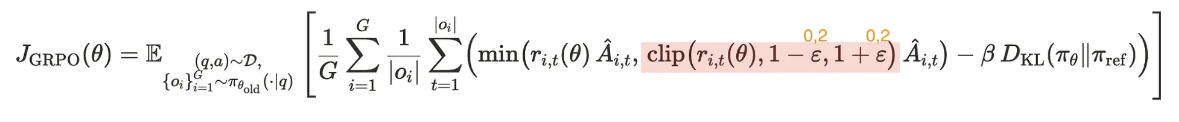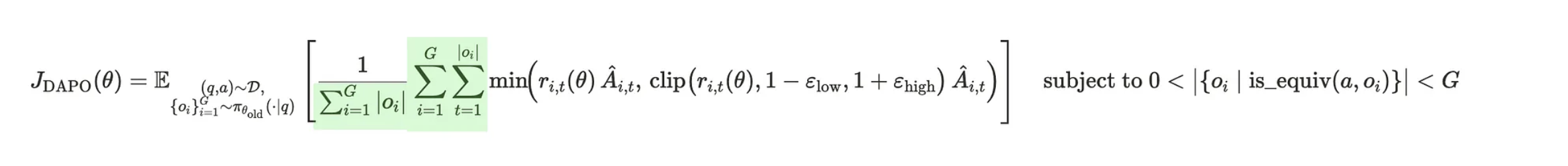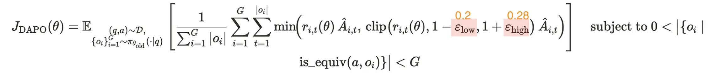 Instead of using a single parameter (0.2) for both boundaries, DAPO uses: Lower boundary: 0.2 (unchanged) and Upper boundary: 0.28 (increased).