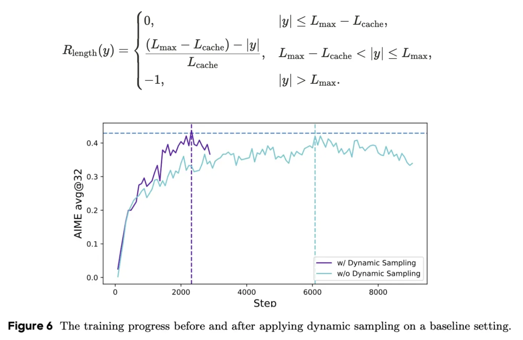 Surprisingly, this oversampling approach doesn’t slow down training. In fact, it accelerates progress dramatically — achieving the same performance with only a third of the training steps compared to models without Dynamic Sampling.
