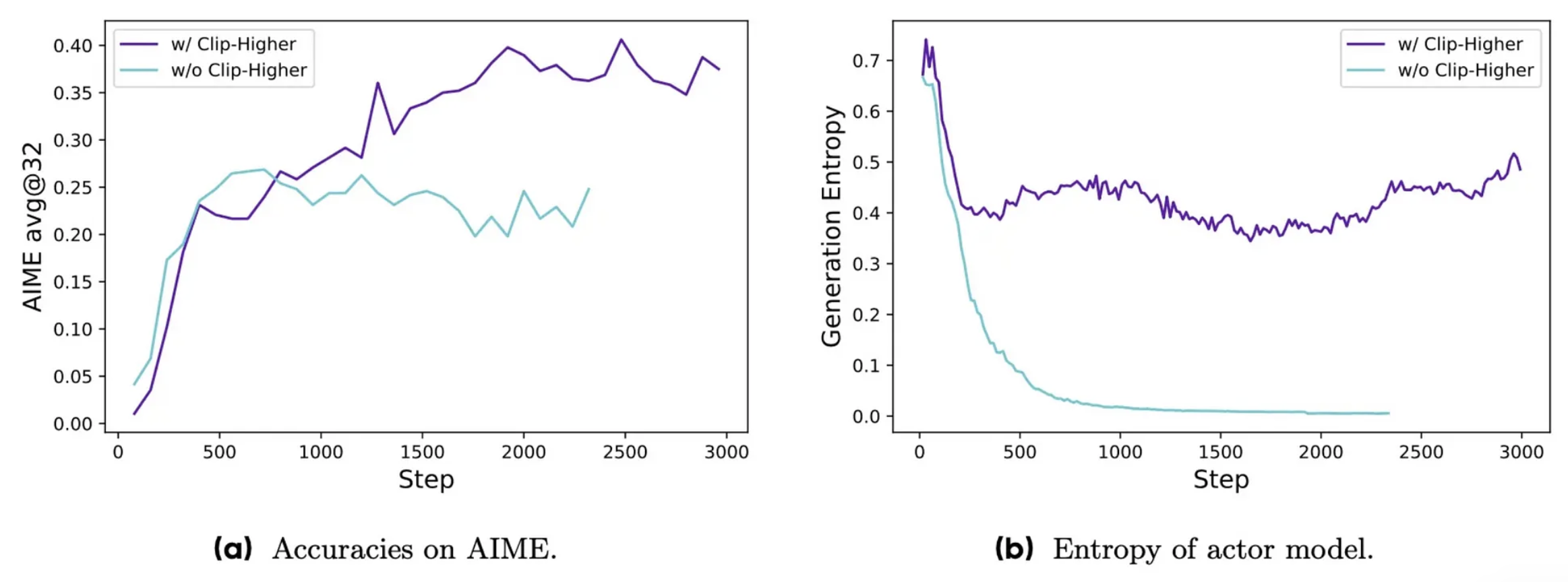 DAPO introduces “Clip-Higher,” which decouples the lower and upper clipping boundaries.